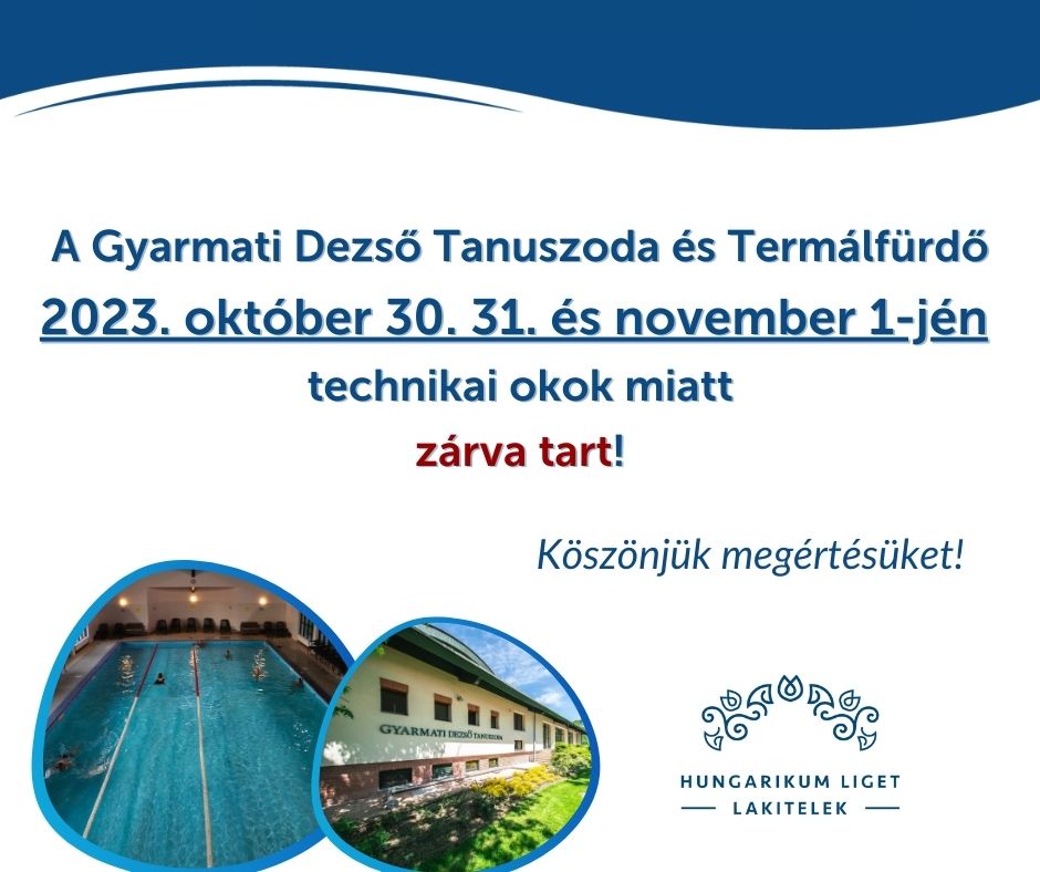 Tájékoztatjuk Vendégeinket, hogy a Gyarmati Dezső Tanuszoda és Termálfürdő technikai okok miatt 2023. október 30, 31 és november 1-jén zárva tart!