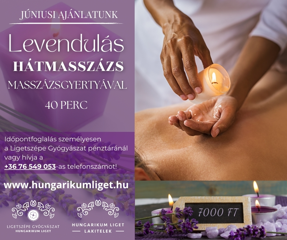 Júniusi ajánlatunk a masszázsgyertyával végzett levendulás hátmasszázs. Nemcsak a testre, hanem a lélekre is pozitív hatással van, segítve a teljes ellazulást és a regenerálódást.