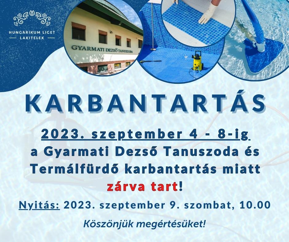Tájékoztatjuk Önöket, hogy a Gyarmati Dezső Tanuszoda és Termálfürdő 2023. szeptember 4 - 8. között karbantartás miatt zárva tart!