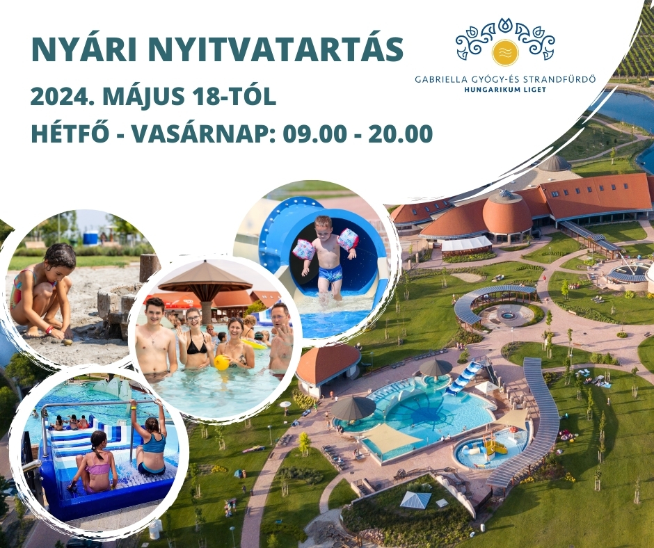 A nyár közeledtével a lakiteleki Gabriella Gyógy- és Strandfürdő is átáll a nyári nyitvatartásra. Május 18-tól hétfőtől-vasárnapig 09.00 - 20.00-ig várunk mindenkit. Kültéri medencéink május 31-től üzemelnek!