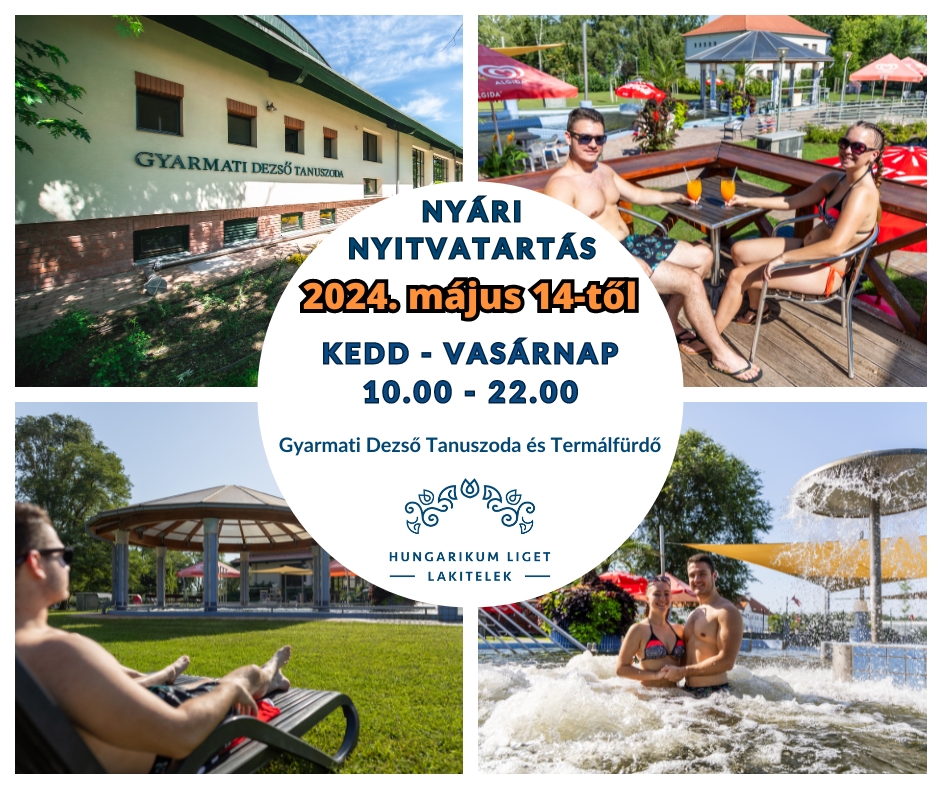 Hamarosan itt a nyár! Nem csak a nappalok hosszabbodnak, hanem a nyitvatartási idő is! 2024. május 14-től a lakiteleki Gyarmati Dezső Tanuszoda és Termálfürdő nyári nyitvatartással, keddtől-vasárnapig 10.00 - 22.00-ig üzemel! Szeretettel várjuk Önöket!