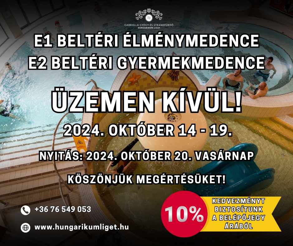 Tájékoztatjuk Önöket, hogy a Gabriella Gyógy- és Strandfürdő beltéri élmény- és gyermekmedencéje 2024. október 14-19-ig nem üzemel!