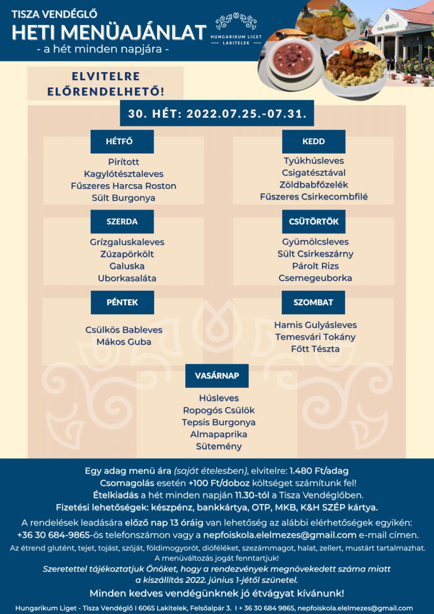 Tisza Vendéglő heti menü ajánlata 2022. 07.25. - 07.31.