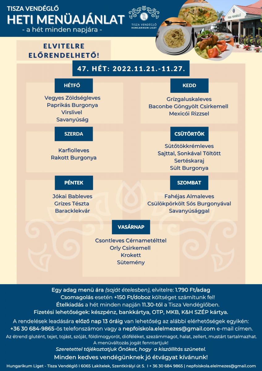 Tisza Vendéglő heti menü ajánlata 2022. 11. 21. - 2022. 11. 27.