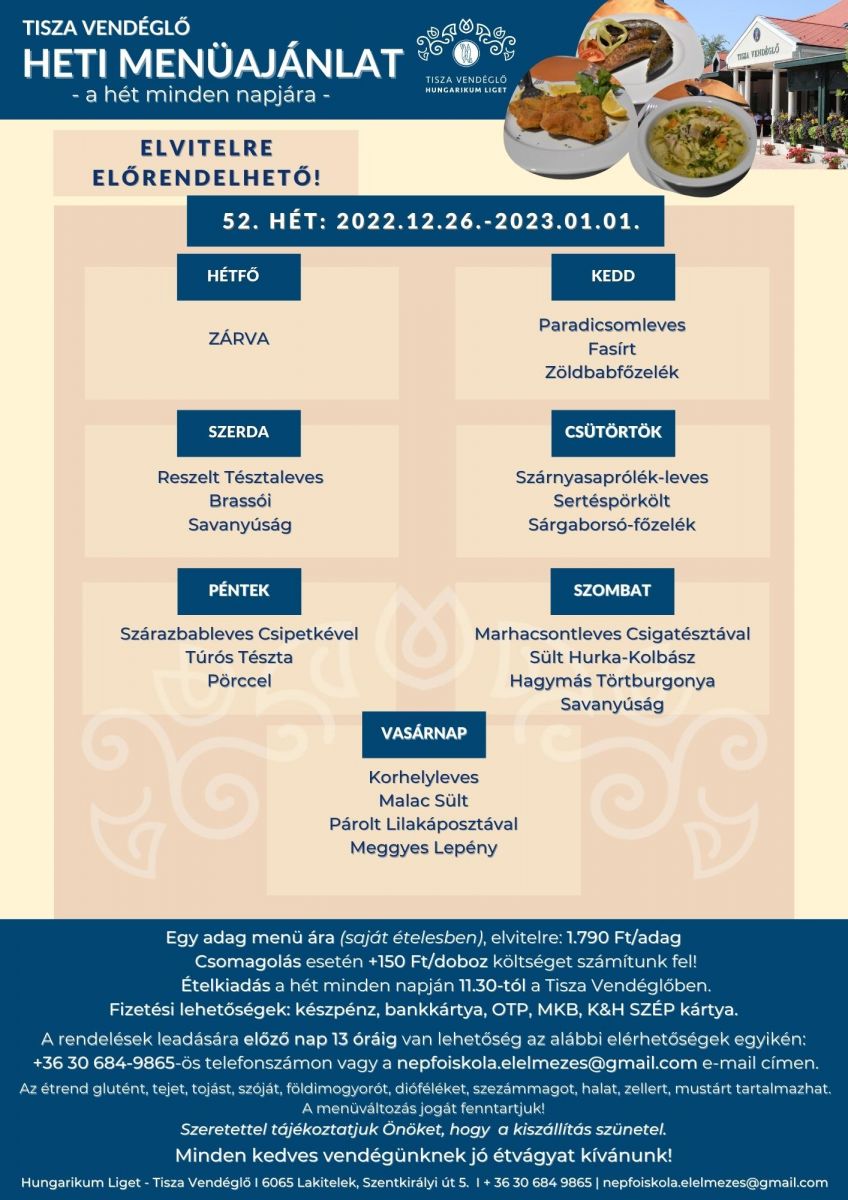 Tisza Vendéglő heti menü ajánlata 2022. 12. 26. - 2023. 01. 01.