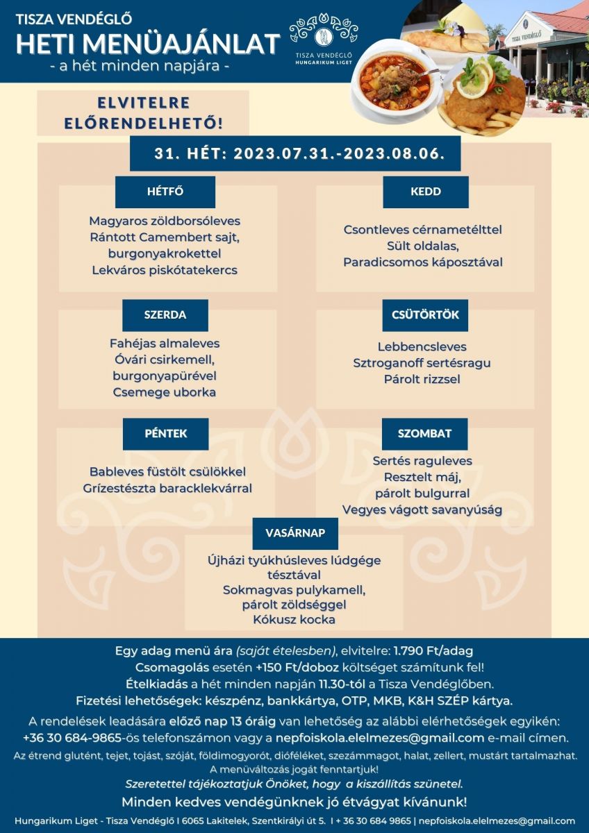 Tisza Vendéglő heti menü ajánlata 2023.07.31. - 2023.08.06.