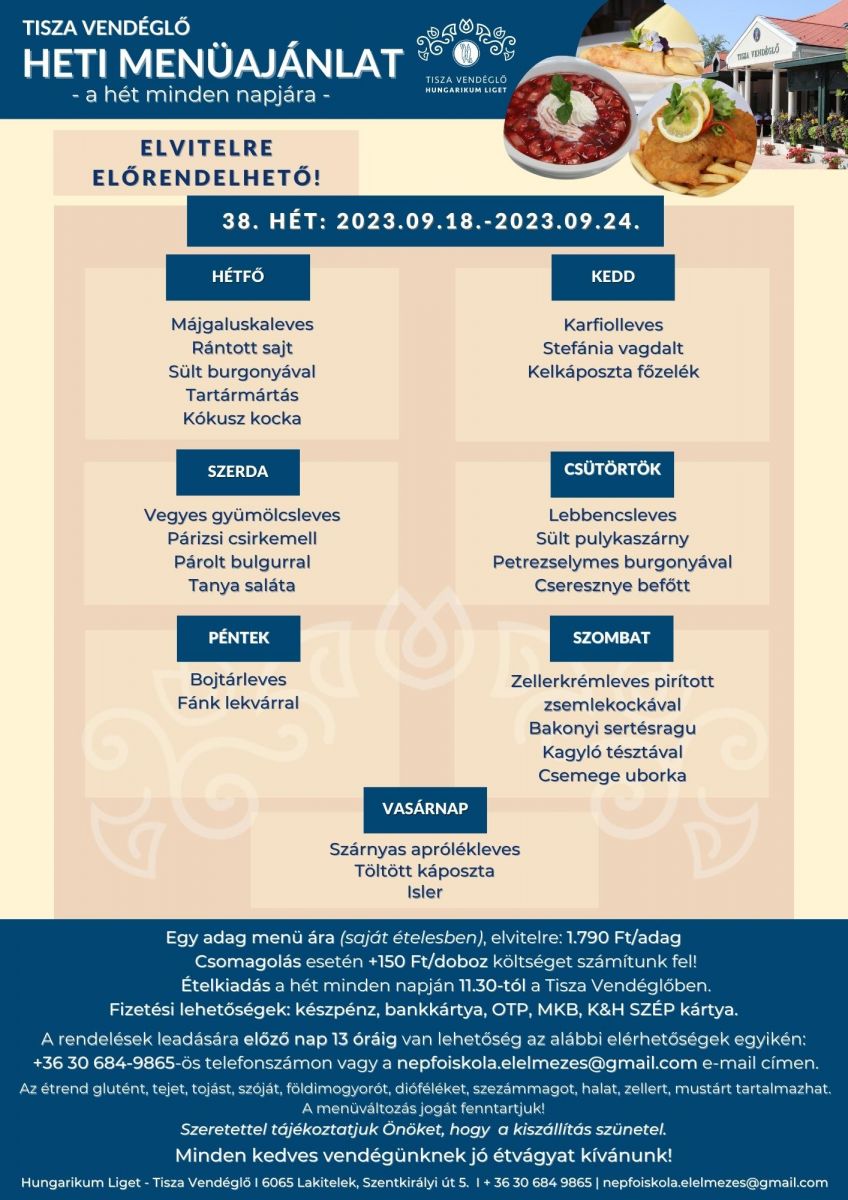 Tisza Vendéglő heti menü ajánlata 2023.09.18.-2023.09.24.