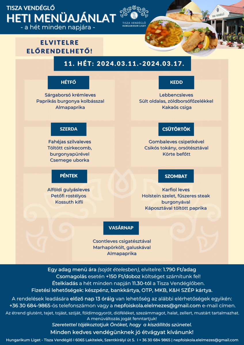Tisza Vendéglő heti menü ajánlata 2024.03.11.-2024.03.17.