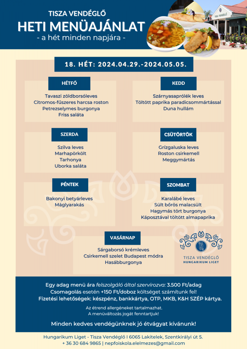 Tisza Vendéglő heti menü ajánlata 2024.04.29.-2024.05.05.