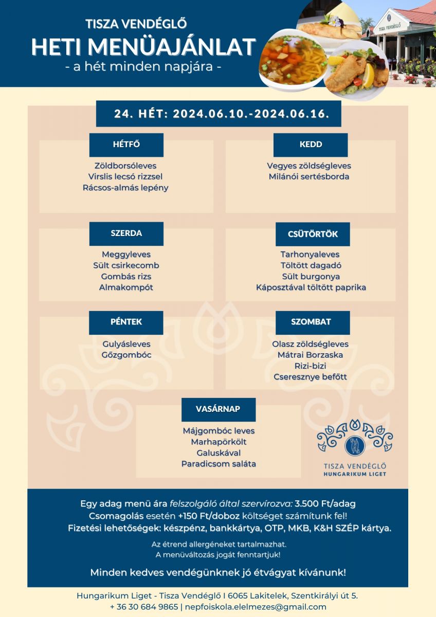 Tisza Vendéglő heti menü ajánlata 2024.06.10.-2024.06.16.