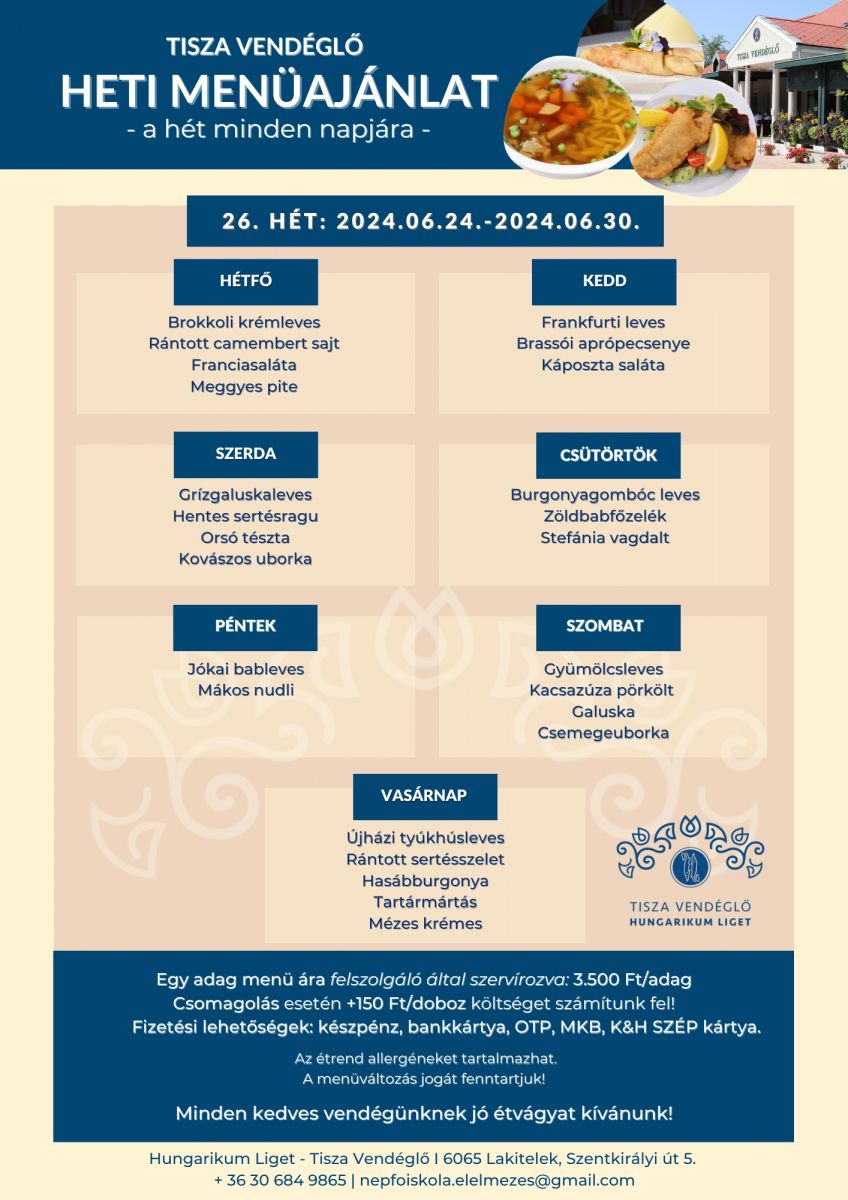 Tisza Vendéglő heti menü ajánlata 2024.06.24.-2024.06.30.