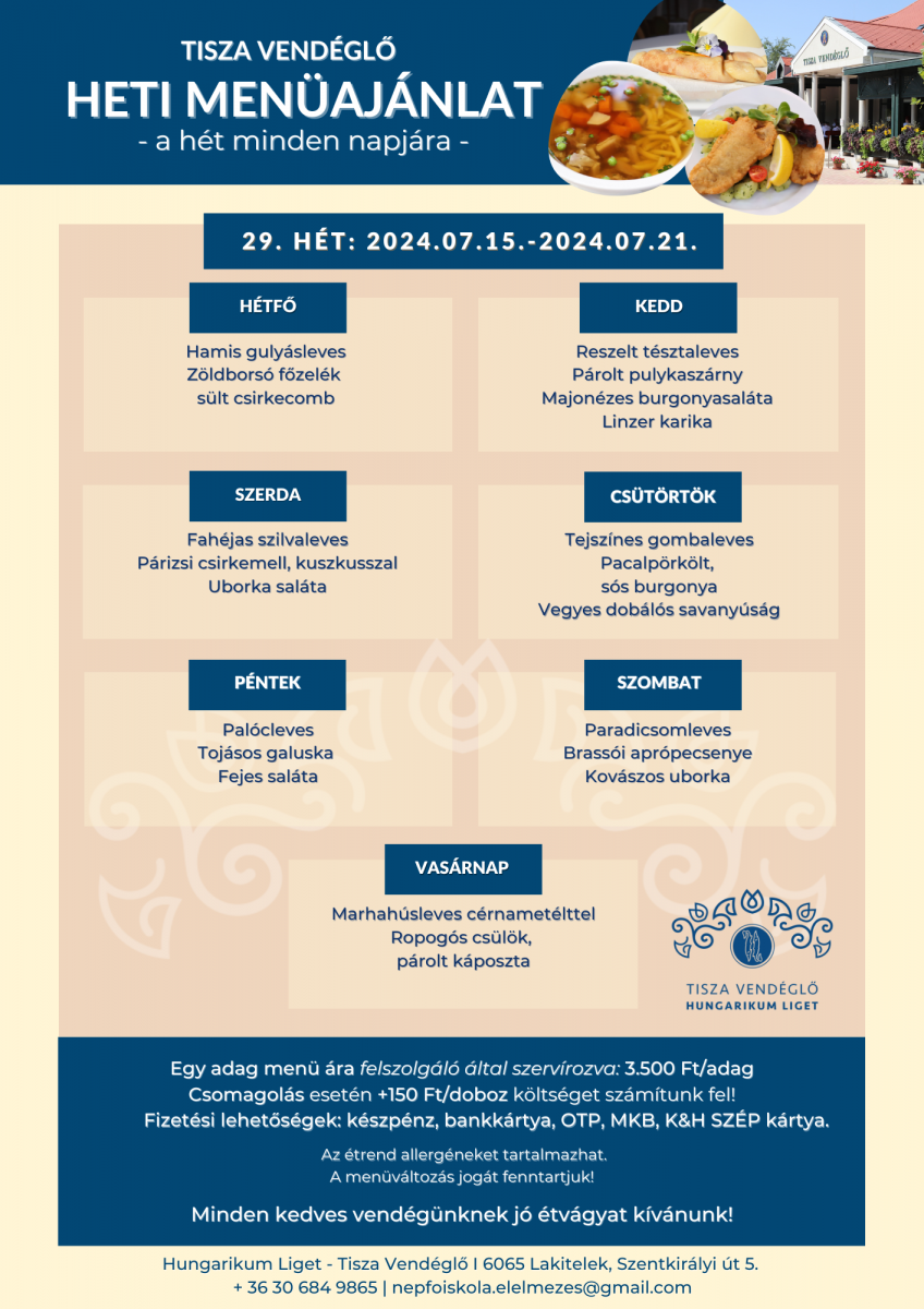 Tisza Vendéglő heti menü ajánlata 2024.07.15.-2024.07.21.