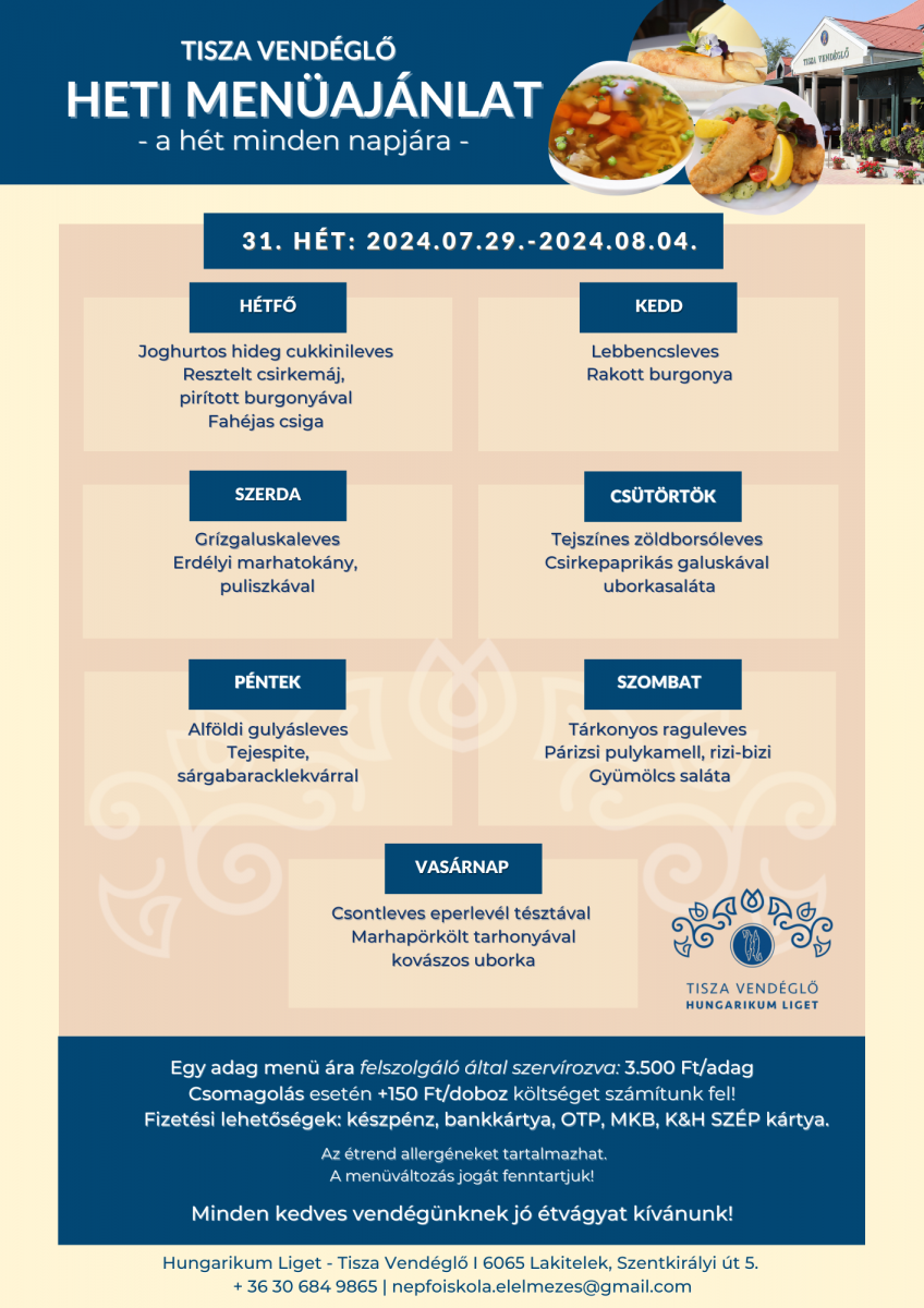 Tisza Vendéglő heti menü ajánlata 2024.07.29.-2024.08.04.