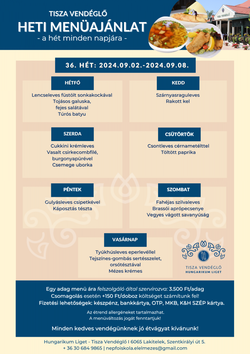 Tisza Vendéglő heti menü ajánlata 2024.09.02.-2024.09.08.
