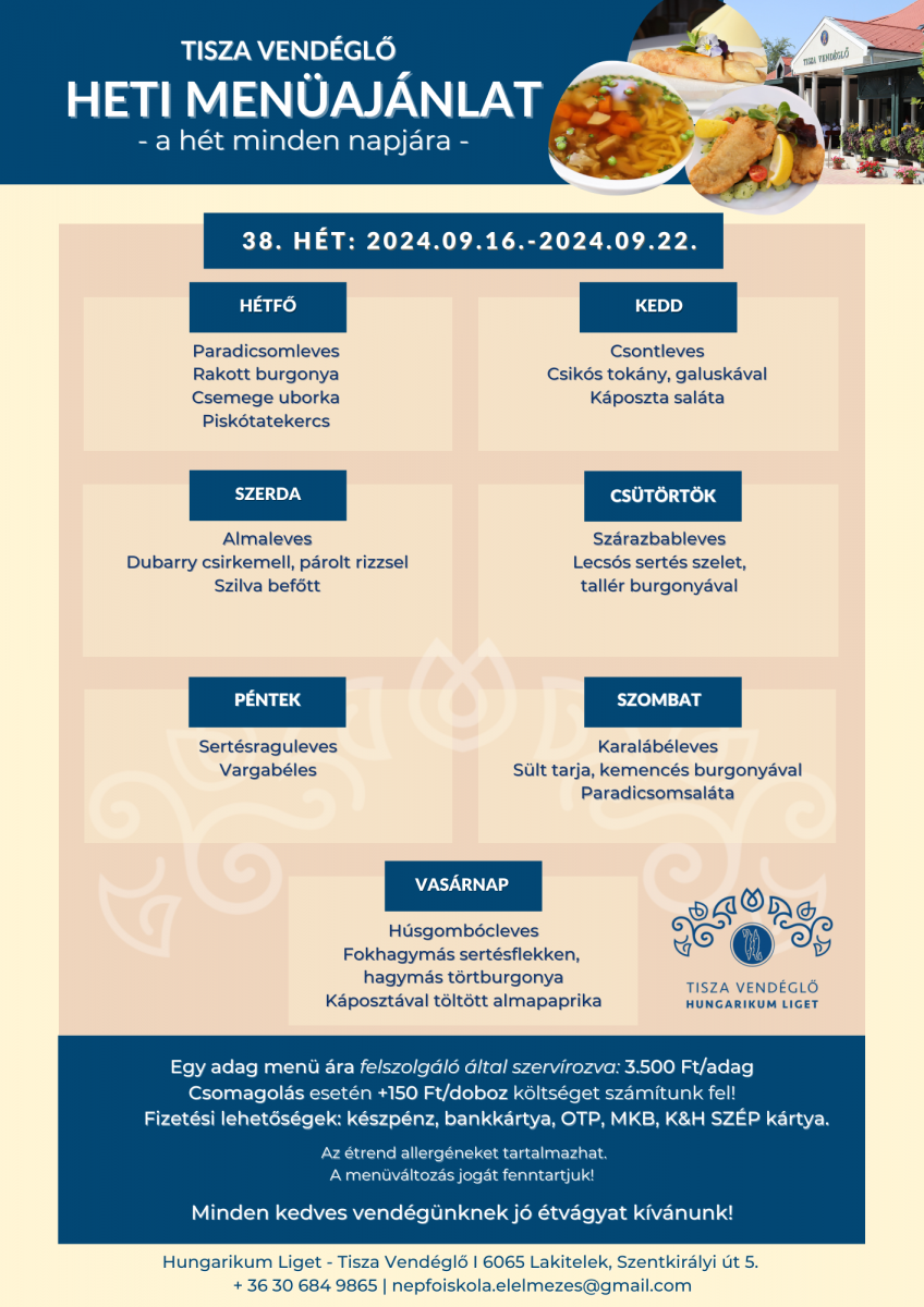 Tisza Vendéglő heti menü ajánlata 2024.09.16.-2024.09.22.