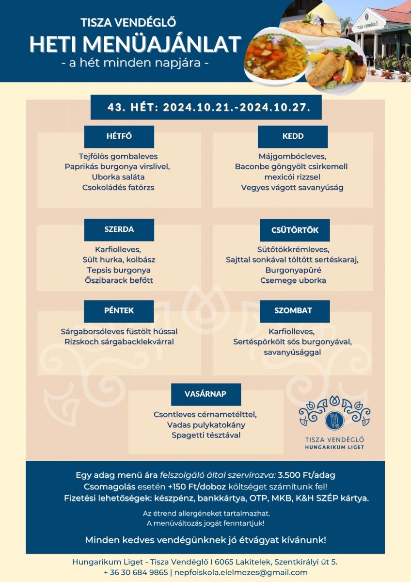 Tisza Vendéglő heti menü ajánlata 2024.10.21.-2024.10.27.
