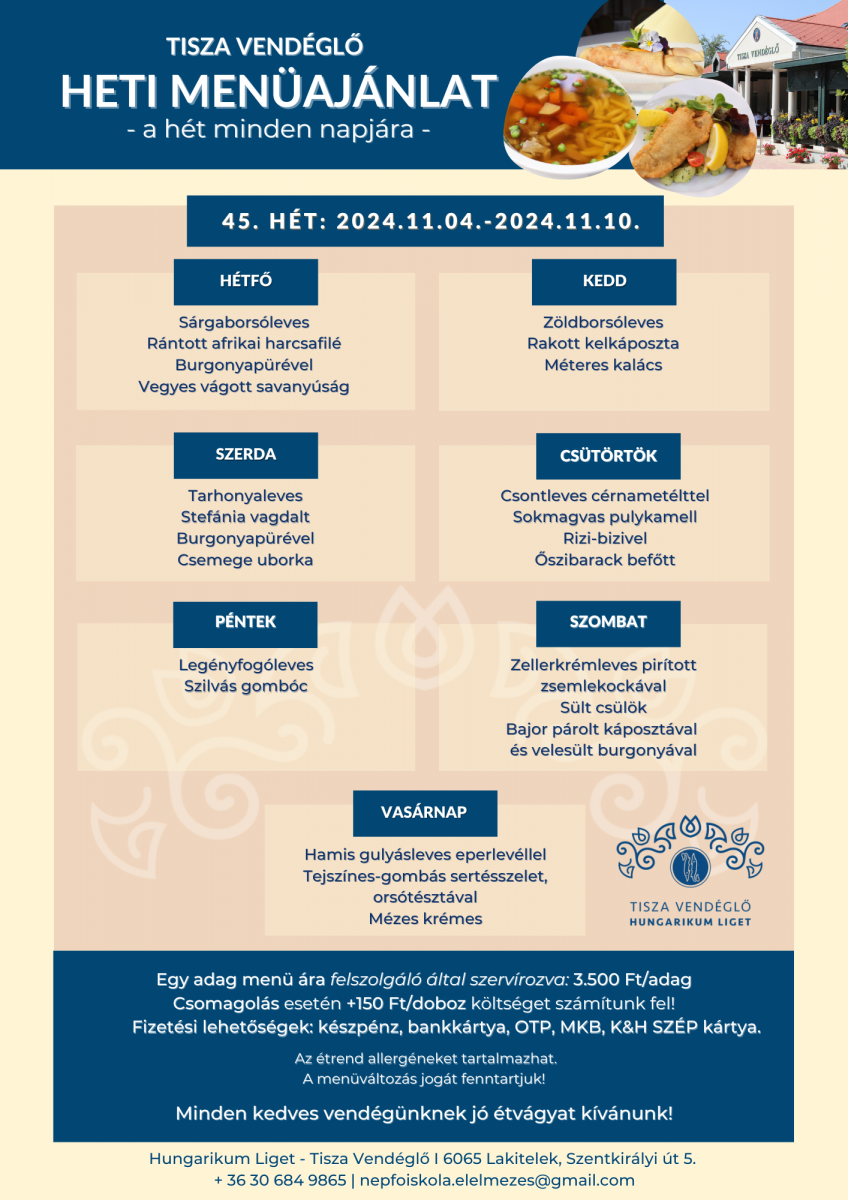 Tisza Vendéglő heti menü ajánlata 2024.11.04.-2024.11.10.
