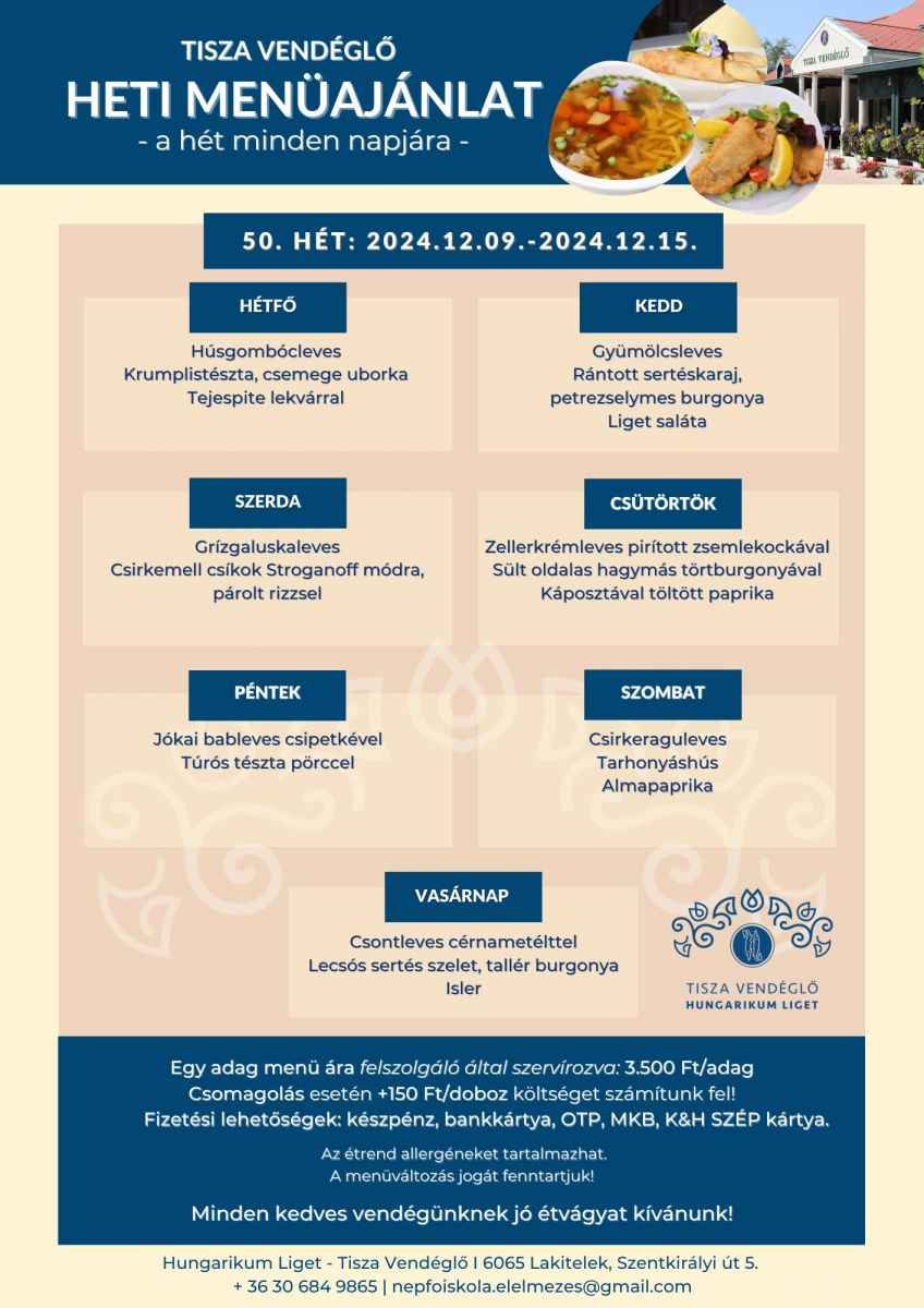 Tisza Vendéglő heti menü ajánlata 2024.12.09.-2024.12.15.