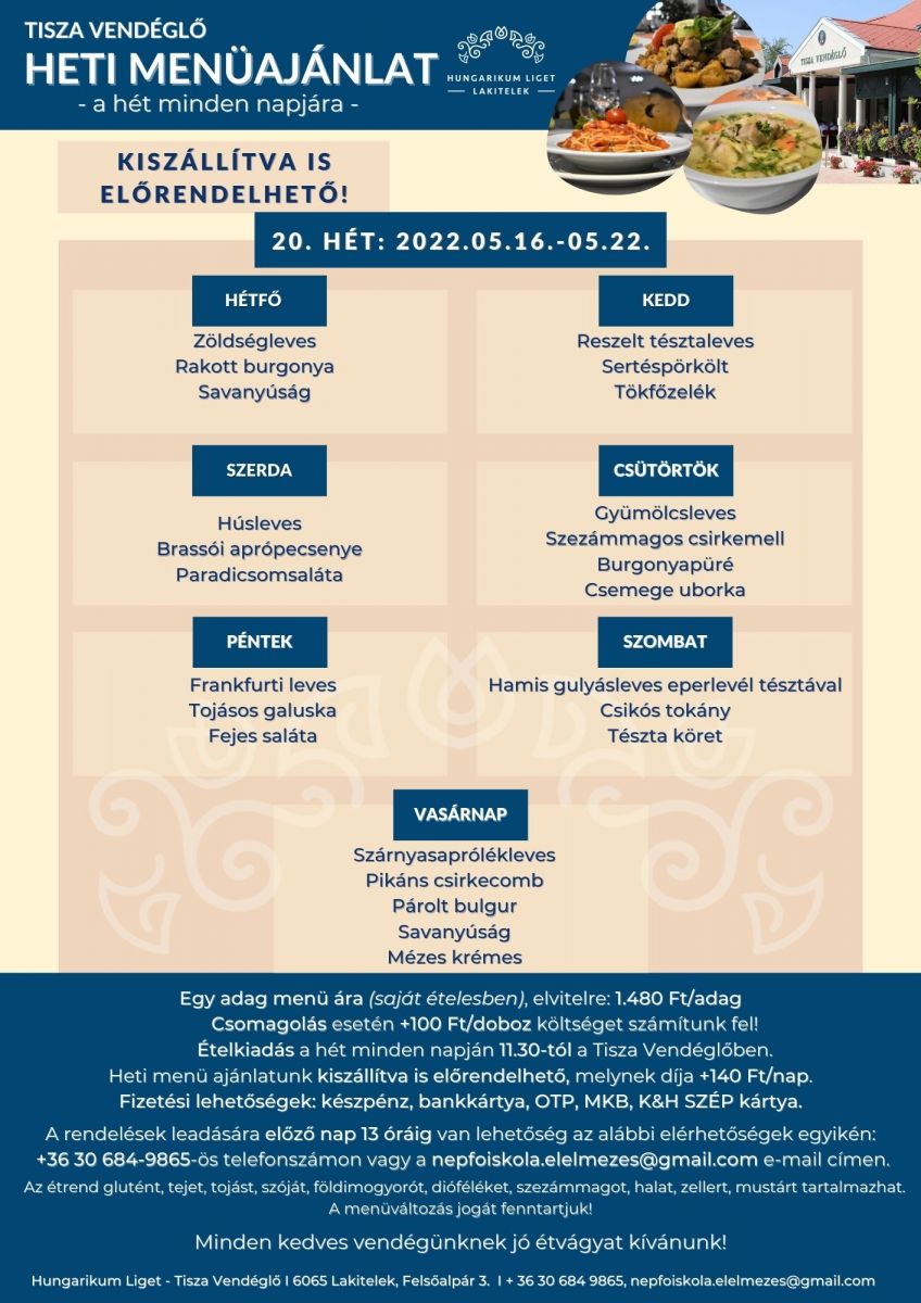 Ételkiadás: a hét minden napján 11.30-tól a Tisza Vendéglőben.