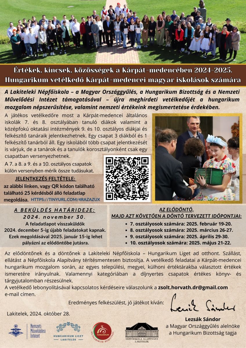 A Lakiteleki Népfőiskola – a Magyar Országgyűlés, a Hungarikum Bizottság és a Nemzeti Művelődési Intézet támogatásával – újra meghirdeti vetélkedőjét a hungarikum mozgalom népszerűsítése, valamint nemzeti értékeink megismertetése érdekében.