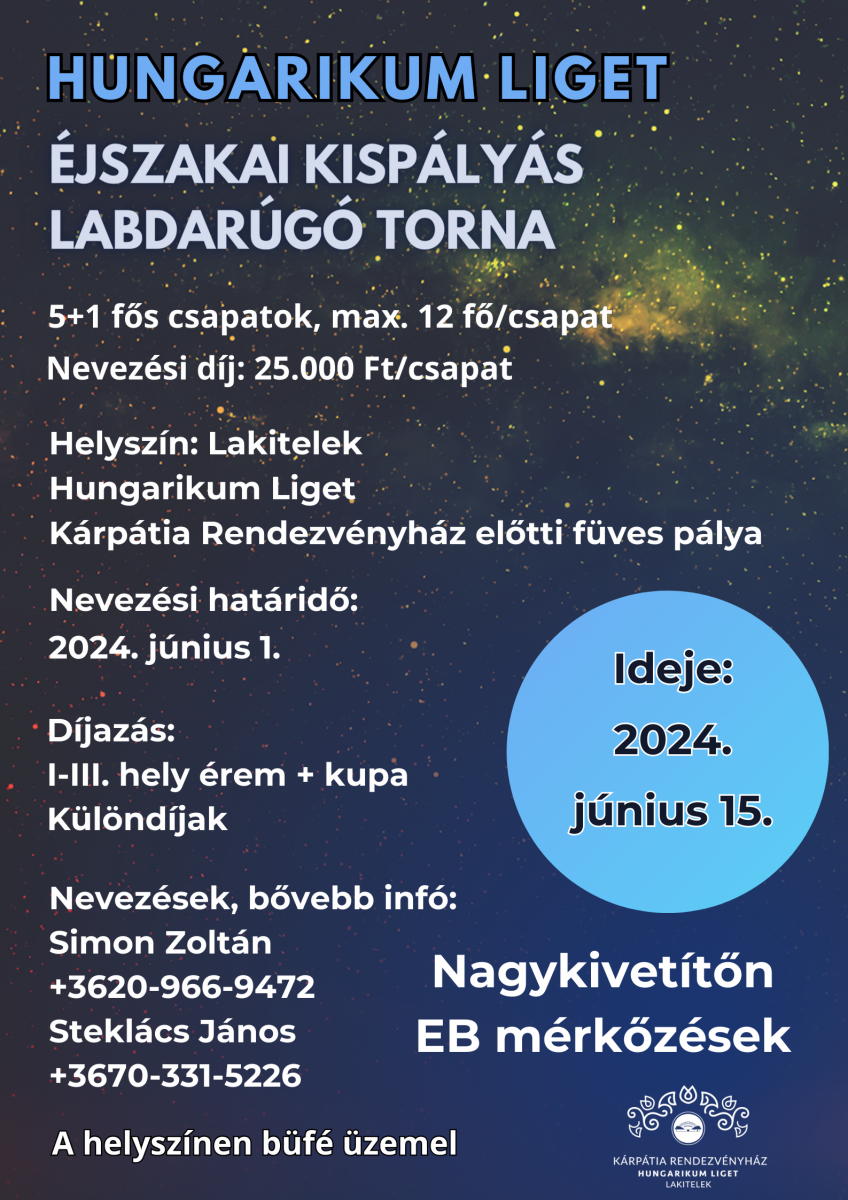 2024. június 15-én izgalmas éjszakai kispályás labdarúgó tornát rendezünk a lakiteleki Hungarikum Liget - Kárpátia Rendezvényház melletti füves területen, ahol 12 lelkes csapat verseng majd a győzelemért!