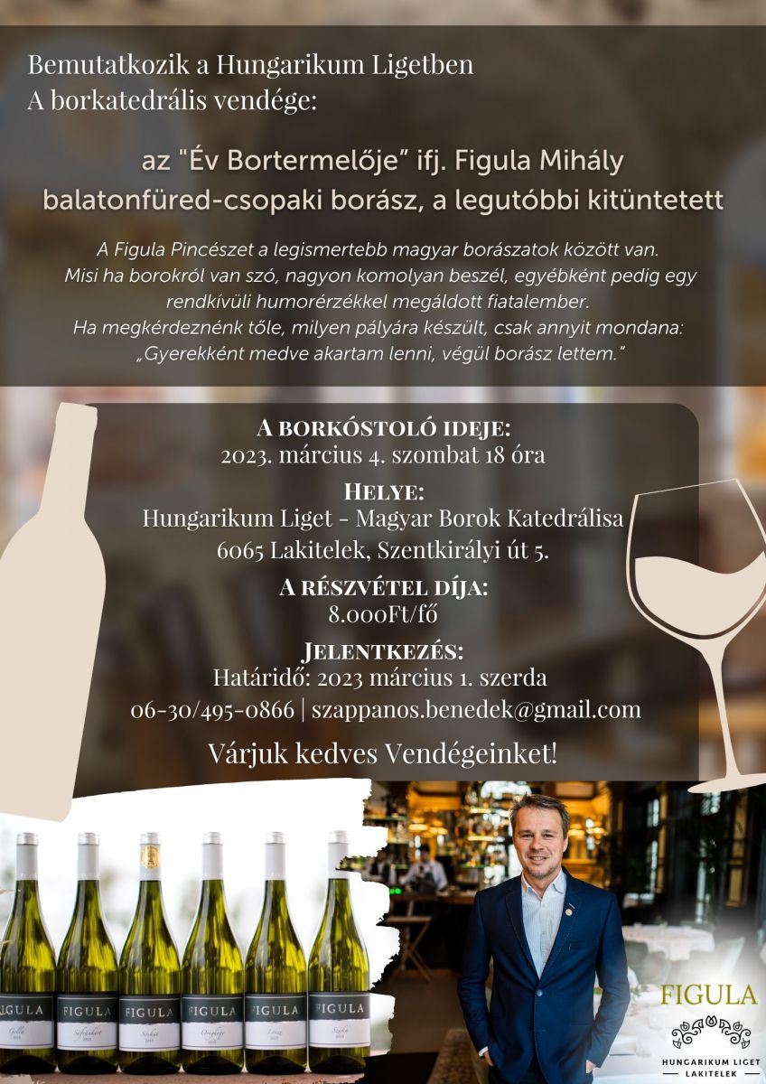 Szeretettel várjuk kedves Vendégeinket március 4-én a Magyar Borok Katedrálisában tartandó borestre, ahol bemutatkozik az "Év Bortermelője” ifj. Figula Mihály, balatonfüred-csopaki borász.