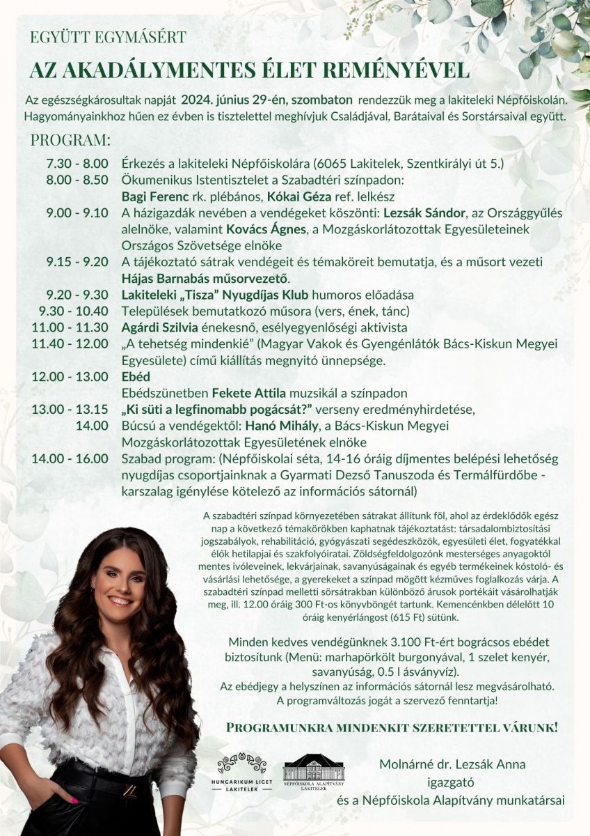 Az egészségkárosultak napját 2024. június 29-én, szombaton rendezzük meg a lakiteleki Népfőiskolán. Hagyományainkhoz hűen ez évben is tisztelettel meghívjuk Családjával, Barátaival és Sorstársaival együtt.