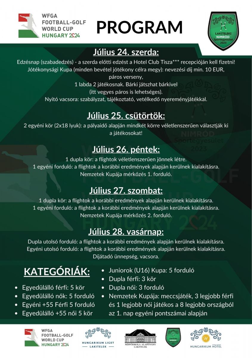 Örömteli hírrel számolhatunk be, hogy 2024. július 25-28. között Lakiteleken a Hungarikum Ligetben található, Nimród Footgolf Parkban Football-Golf Világbajnokság fog zajlani.
