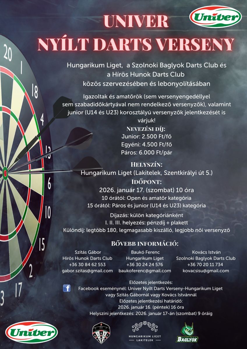 A Hungarikum Liget, a Szolnoki Baglyok Darts Club és a Hírös Hunok Darts Club közös szervezésében és lebonyolításában 2026. január 17-ére nyílt darts versenyt hirdet.